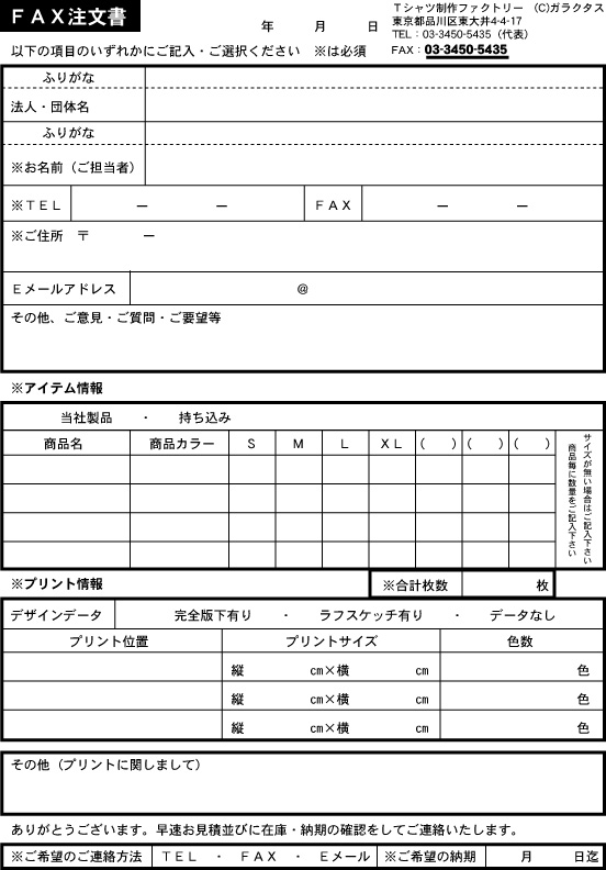 Tシャツ制作ファクトリーオーダーフォームです。こちらからオーダーいただきました内容にてお見積[無料]させていただきます。